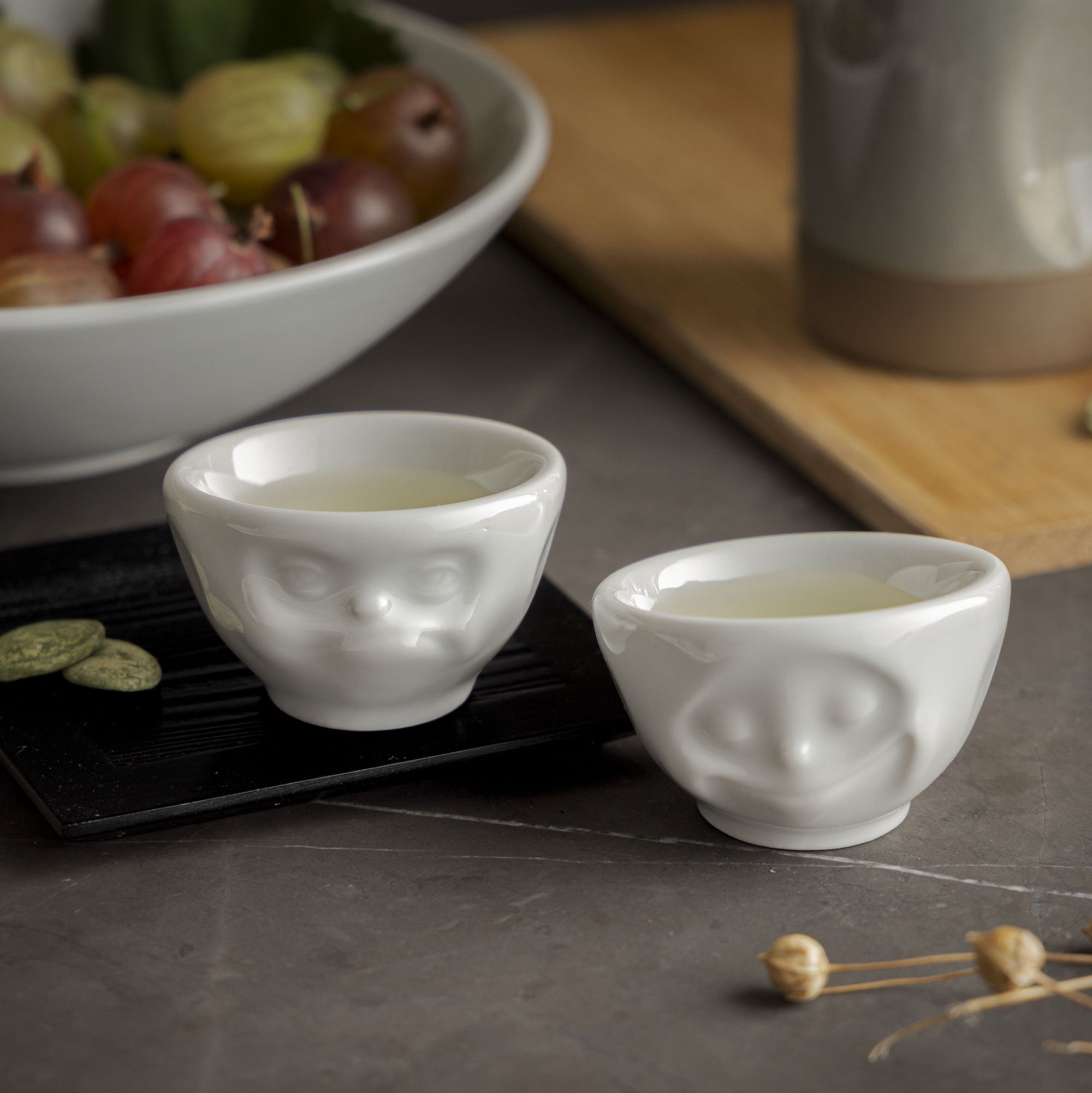 Набор Tassen Glad&Hmpff, состоящий из двух белых глянцевых подставок для яиц от популярного немецкого производителя 58 Products, станет достойным кухонным аксессуаром и украсит любое застолье. Забавные мордашки с выразительной мимикой из высококачественного фарфора также можно использовать как емкости для различных соусов и специй.
